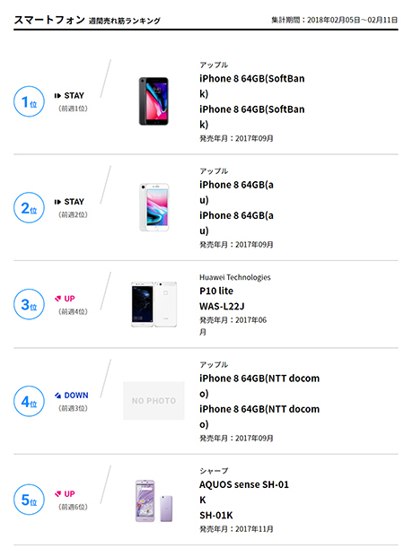 2018年2月5日~2月11日のスマートフォン販売台数ランキング(1位~5位)