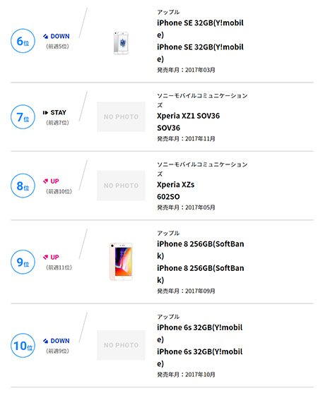 2018年2月5日~2月11日のスマートフォン販売台数ランキング(6位~10位)