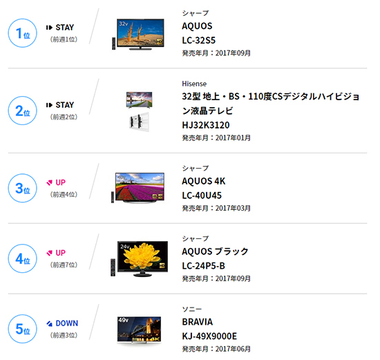 2018年2月5日~2月11日の薄型テレビ販売台数ランキング(1位~5位)