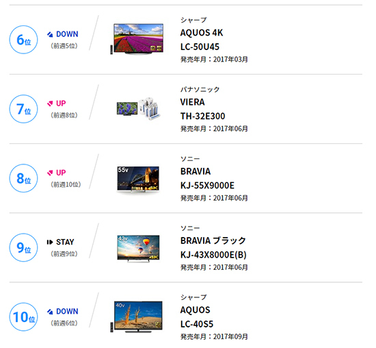 2018年2月5日~2月11日の薄型テレビ販売台数ランキング(6位~10位)