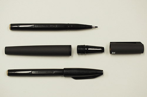 言わずとしれた文具の老舗、伊東屋のオリジナル商品。キャップを開けてみると、見覚えのあるペン先が現れた。サインペンだ。まさかと思って分解すると、中から「ぺんてるサインペン」の本体が出てきた。商品名に「ジャケット」とあったのは、既存のペンの「ケース」という意味だったのだ。税込価格は5400円。サインペンとしては破格の値段だが、そのその形に魅入られてしまい、即買いした。