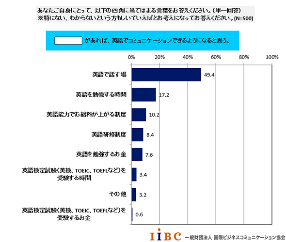また、穴埋め式で、英語でコミュニケーションできるようになるために必要なことをたずねると、「英語で話す場」が500人中247名(49.4%)と、大差で1位となり、2位は「英語を勉強する時間」(17.2%)、3位は「英語能力で給料が上がる制度」(10.2%)だった。