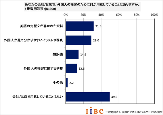 約半数の49.6%が「会社/お店で用意していることはない」と回答した一方で、31.6%は「定型文が書かれた資料」、29.0%は「外国人が見てわかりやすいイラストや写真」、14.6%は「翻訳機」を用意していると回答。複数回答で17.6%は、「定型文が書かれた資料」「わかりやすいイラストや写真」の両方を用意している。