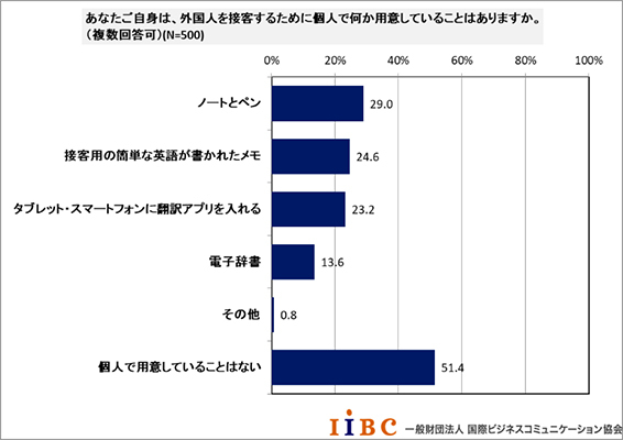 外国人を接客するために個人的に用意しているものをきくと、「個人で用意していることはない」が半数以上(51.4%)を占め、実際に用意しているものも「ノートとペン」(29.0%)、「接客用の簡単な英語が書かれたメモ」(24.6%)、「タブレット・スマートフォンに翻訳アプリを入れる(23.2%)」などに分散した。