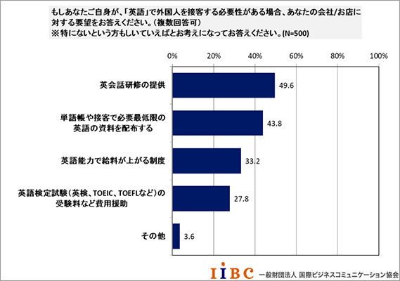 英語で外国人の接客をする必要性がある場合に、会社/お店に対する要望をきくと、「英会話研修」がもっとも多く(49.6%)、「単語帳や接客で必要最低限の英語の資料を配布する」(43.8%)、「英語能力で給料が上がる制度」(33.2%)が続いた。