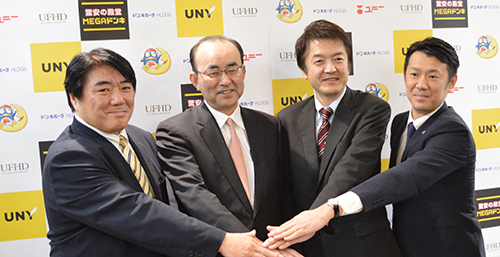 ユニファミマHDの子会社である総合スーパー(GMS)のユニーがドンキHDの出資を受け入れたのは2017年8月。11月にユニファミマHDが40%の株式を譲渡し、本格的な業務提携がスタートした。年が明けた1月にユニーが運営する「ピアゴ」と「アピタ」の6店舗を両社のダブルネーム店舗として業態転換することを発表。今回の「MEGAドン・キホーテUNY大口店」が1号店となる。