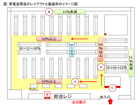 一般的なワンフロアの家電量販店のレイアウトに顧客の通過率を落とし込んだ図を参考に、詳しく解説しよう。例えば、100人の顧客が入店すれば黄色地の主通路Aの通過率は50%以上なので、50人以上が通過する。これに対して壁面Bは、15人程度しか通過しないことを表す。