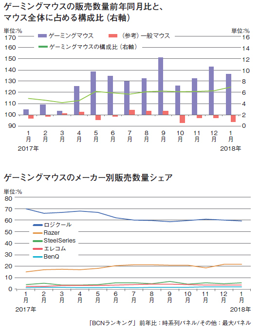 メーカー別では、ゲーミング用途では比較的安価な「G300s」を筆頭に、高価格帯も含め豊富なラインアップで展開するロジクールが6割水準のシェアを維持し、ダントツの強さを誇っている。しかし、徐々に勢力を拡大しているのがゲーミングに特化したRazer。安定的に2割程度のシェアが取れるようになってきている。