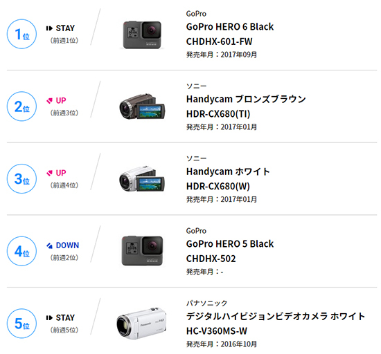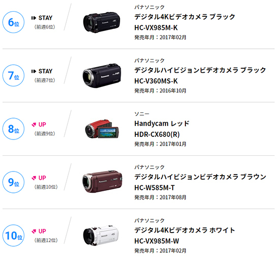 2018年2月12日~2月18日のデジタルビデオカメラ販売台数ランキング(6位~10位)