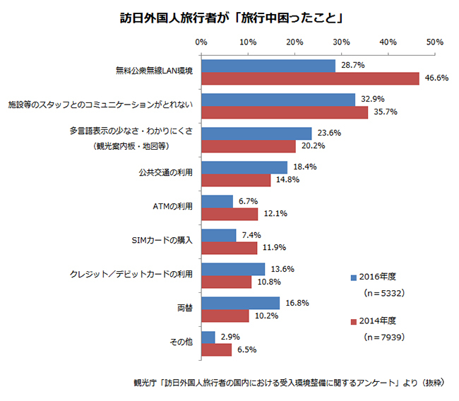 観光庁が16年の9月から10月にかけて行った調査では、「無料公衆無線LAN環境について、前回の訪日時と比べて『かなり改善している』『多少改善している』」と回答した外国人旅行者が60.5%に上り、「改善していない」の8.7%を大幅に上回った(回答数は1903)。日本がWi-Fi後進国だった時期があったとしても、それは過去のものだろう。