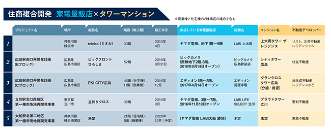 テナントの選択・決定権は、再開発組合にあり、広島の事例では、ビックカメラ自身がB地区の再開発組合に参画している。高層の住宅棟と低層の商業棟に分けて一体開発するケースや、商業施設に隣接する区画に、別の不動産デベロッパーが大規模マンションやタワーマンションを建設するケースもあり、家電量販店の上層階やそばに住んでいる人は意外に多そうだ。
