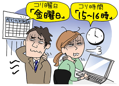 パナソニックは3月2日、20~40代のビジネスパーソン男女500人を対象に「ビジネスパーソンのコリ事情」を調査したと発表した。PCやスマートフォン(スマホ)の長時間利用で「コリ」を感じている人が多く、しかもコリのピークとして、「コリ曜日」が金曜日、「コリ時間」が15~16時ということがわかった。調査期間が2月13~15日、インターネット調査で実施した。