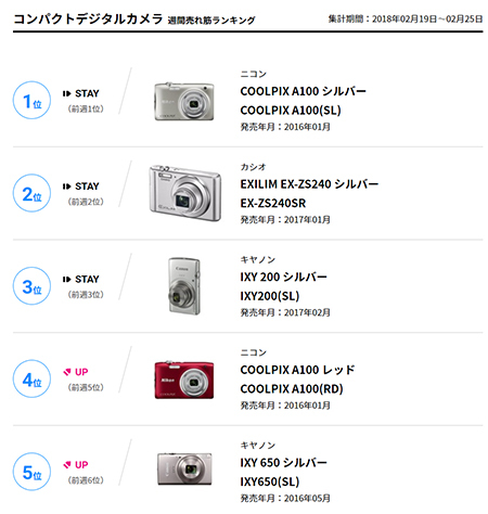 2018年2月19日~25日のコンパクトデジタルカメラ販売台数ランキング(1位~5位)