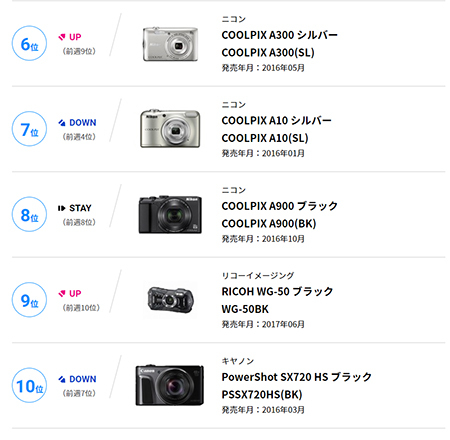 2018年2月19日~25日のコンパクトデジタルカメラ販売台数ランキング(6位~10位)