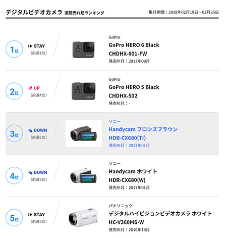 2018年2月19日~2月25日のデジタルビデオカメラ販売台数ランキング(1位~5位)