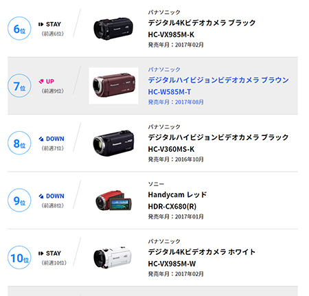 6~10位で目立っているのは、7位のパナソニック「HC-W585M-T」。前週9位からの2ランクアップだ。コンパクトなボディサイズでカラーはブラウン。進化した「手振れロック」機能を搭載している。被写体に寄った撮影が可能で、子どもの表情や姿を高画質で記録できる。「HC-W585M」は、ほかにもピンクとホワイトを用意している。