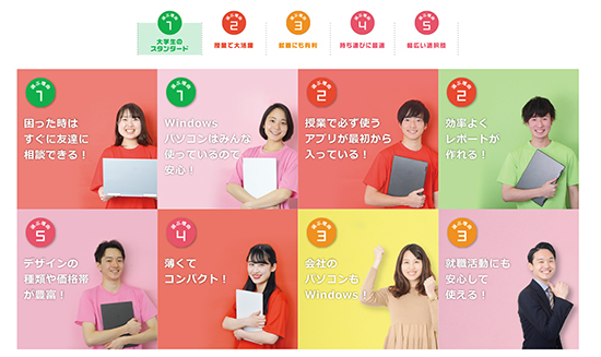 そして、「勝ちパソコン」のメッセージ性を色濃く反映しているのが「就職にも有利」という点だろう。企業の営業や経営企画、人事、マーケティングなど多くの部署でWindows PCが使われていることから、就活でも安心して使える点をアピールする。