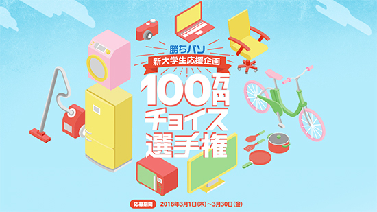 「勝ちパソコン」のキャンペーンに合わせて、3月1日から30日まで新大学生応援企画「100万円チョイス選手権」を開催中。ホームページの応募画面からTwitterのアカウントでログインし、欲しいPC1台と14アイテムの欲しい賞品から、合計金額が100万円になるまで選ぶ。1331パターンの組み合わせのなかから、自分の選んだ組み合わせが1人しかいなかったら、選んだ100万円分の商品をすべてプレゼントするというもの。PC市場を盛り上げる上でも、家電量販店の売り場で顧客に一声かけてアピールしたい。