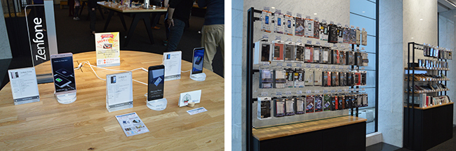 「販売」は、店内に陳列する「ZenFone」や「ZenPad」「ZenBook」など、人気シリーズの最新端末が対象で、これまで購入前に触れる機会がなかったオフィシャルWebストア限定モデルの実機があるのもファンにはうれしい。また、各種の周辺機器が充実しているのも特徴だ。ここまでの品数が揃っているのは、直販店ならではだろう。