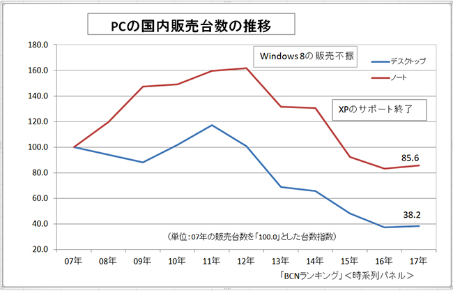まず、「BCNランキング」で過去10年の国内PC販売台数の推移をみていこう。07年の販売台数を「100」とした指数でみると、17年はデスクトップが「38.2」と6割減、ノートPCは「85.6」と15%減と大幅に落ち込んでいることがわかる。とくに12年はWindows 8の販売不振、その後は14年4月の消費増税とWindows XPのサポート終了が市場の縮小に拍車をかけた。しかし、なぜウイルスバスターは売れているのか。