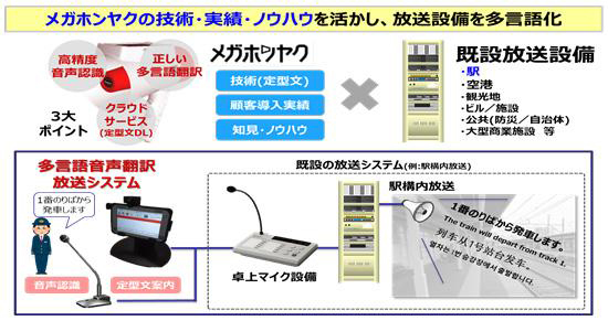 JR西日本は3月9日、訪日外国人の利用が多い駅に、パナソニック製のメガホン型多言語音声翻訳サービス「メガホンヤク」のソフトウェアをタブレット端末「TOUGHPAD」に搭載して駅構内の放送設備に接続した「多言語音声翻訳放送システム」の導入を発表した。このシステムによって、駅のコンコースやホームであらかじめ登録した英語や中国語、韓国語の案内を放送できるようになる。