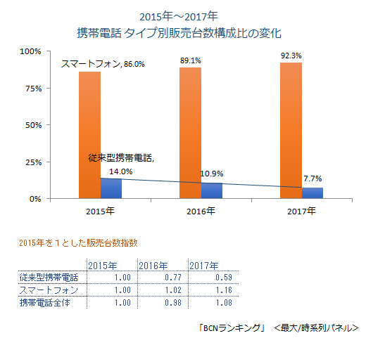 家電量販店の実売データを集計した「BCNランキング」の2017年の年間データによると、携帯電話全体(スマートフォン+従来型携帯電話)の販売台数に占める従来型ケータイの割合は、LTE対応ケータイを含めて7.7%。シニア・キッズ向け以外のiモード端末の販売終了が響き、16年の10.9%から下がり、1割を切った。