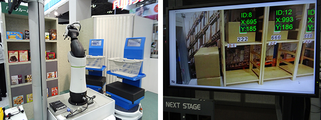 ロボットによる補充業務の支援システム(左)と、ドローン撮影の動画による在庫位置の管理システム
