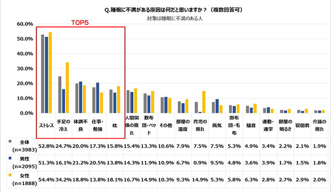 睡眠に不満を持つ人は、その原因として「ストレス」(52.8%)、「手足の冷え」(24.7%)、「体調不良」(20.0%)、「仕事・勉強」(17.3%)、「枕」(15.8%)などを挙げた。「ストレス」は第1回目の調査以来、男女ともに最多で、「手足の冷え」は女性が多く、男性の約2倍に達しいる。