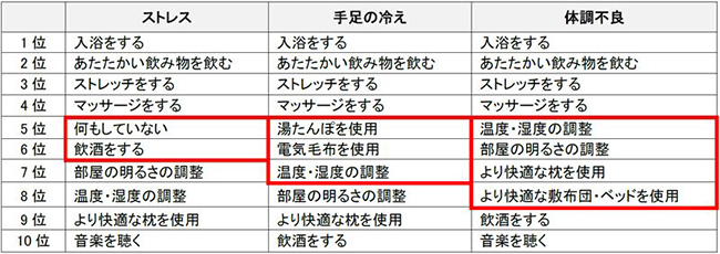 睡眠への不満の原因として多く挙げられた「ストレス」「手足の冷え」を、快眠に対する工夫を照らし合わせると、「ストレス」を感じている人は「何もしていない」「飲酒」が多く、「手足の冷え」を感じている人は「湯たんぽを使用」「電気毛布を使用」「温度・湿度の調整」など、体を温める工夫を行っている。