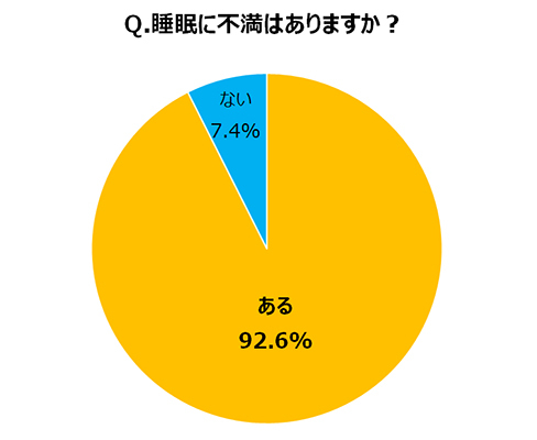 フジ医療器が20歳以上の男女4303名に対して実施した「第5回 睡眠に関する調査」によると、9割以上の92.6%が睡眠に「不満がある」と回答し、「寝ても疲れがとれない」と感じているとわかった。