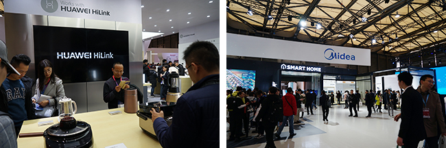 一棟のパビリオンを丸ごと使い、各ブランドの製品を並べた中国家電大手の海爾集団(ハイアール・グループ)は、パビリオンの中心にスマートホームのコーナーを設置した。中国企業では、華為技術(ファーウェイ)や、東芝の家電部門を買収した美的集団もスマートホームの展示に注力していた。