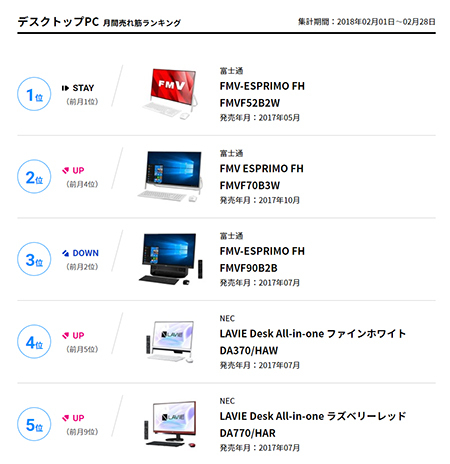 2018年2月1日~28日のデスクトップPC販売台数ランキング(1位~5位)