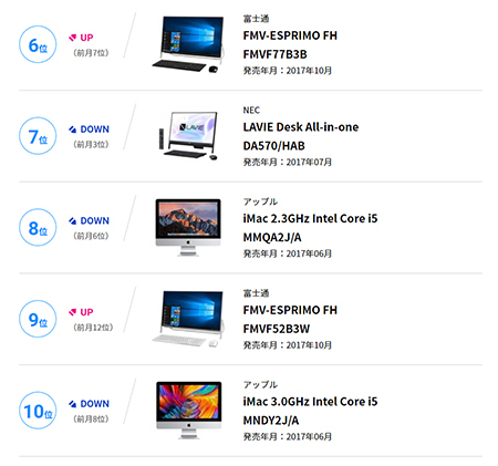 2018年2月1日~28日のデスクトップPC販売台数ランキング(6位~10位)
