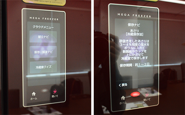 液晶ディスプレイには、節電や製氷、冷凍といった庫内の設定に加えて、クラウドサービス「COCORO KITCHEN」が提案する献立の候補や食材の調理方法が表示される。目で確認することで、使いやすさがより向上した。