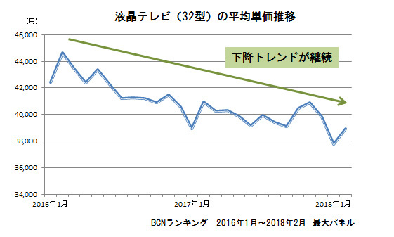 液晶テレビのパネル価格下落が2016年後半から続き、連動するようにテレビの販売価格が下がっている。世界のテレビ市場の動向を3月14日付の日本経済新聞が報じた。中国のテレビ販売の不振から在庫が過剰になったとのことだが、日本に限定して16年1月~18年2月の平均単価の推移を分析すると、必ずしも液晶パネル価格と連動しない市場の実態が分かる。