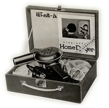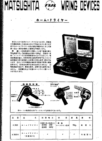 重厚な箱のなかには、持ち手と風の吹き出し口が分かる製品が収められている。吹き出し口はヒーター(電熱器)が搭載してあり、「温風」「涼風」「ストップ」の3段階のモード切替ができるようになっている。パナソニックの彦根工場の50年史(2012年)に収められている資料には、1号機の新製品チラシのような資料が残されている。