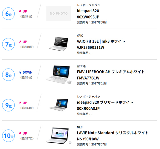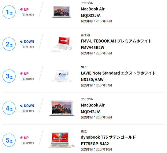 カラーバリエーションやHDD/SDD容量の違いなどを別々に集計した機種別ランキングで、長らくトップだった富士通の「FMV-LIFEBOOK AH」シリーズの「FMVA45B2W」(プレミアムホワイト)は2位に後退。3位には、NECの「LAVIE Note Standard」シリーズの17年夏モデル「NS150/HAW」(エクストラホワイト)が前月8位から急上昇してトップ3入りを果たした。