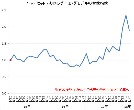 15年2月の販売台数を「1.00」とした際のヘッドセットにおけるゲーミングモデルは、17年11月までは例年と似た動きだったが、12月に跳ね上がり、18年1月には2.5倍近くまで成長した。