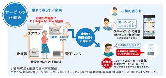 分電盤に小型の「エネルギーセンサー」を設置して家電の稼働状況を推定する独自のシステムを採用している。エアコンや炊飯器、電子レンジ、ドライヤー、掃除機、テレビなどの電力の波形を検知することで、どの家電がどれだけの時間使われているかを推定できる。センサー設置後、10日ほどのデータを分析することで、お客さまの生活リズムやパターンがつかめるという。