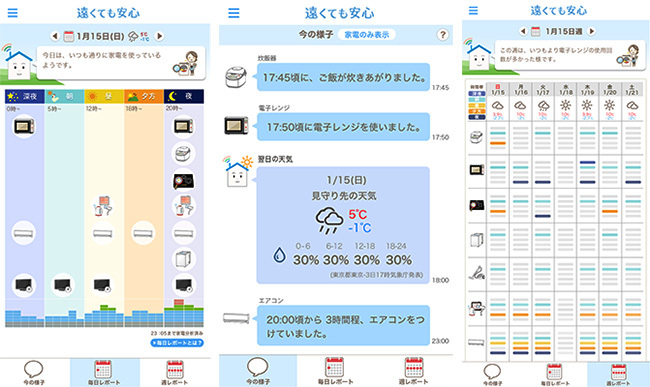 本サービスサイトの閲覧登録は契約者を含めて5人まで可能。別々に暮らす兄弟の家族同士でも、親を一緒に見守ることができる。サービスサイトは、時間帯ごとに使われた家電がアイコンで表示されるので分かりやすい。現在の様子が分かる表示や週ごとのレポートなど、表示方法は自由に切り替えられる。