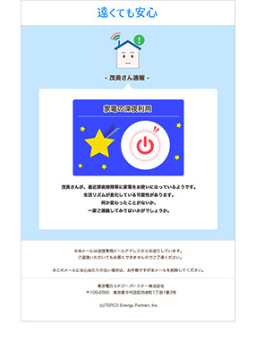 何か異常を検知した際はお知らせメールが送信される。例えば、普段は就寝しているはずの深夜に頻繁に電子レンジを使っていたり、掃除機の電源が長時間もONになったままだったり、猛暑日にエアコンが使われていないなど、今までにない生活リズムの変化が検知されたときには、離れた家族への連絡を促すメッセージとともに、画面で知らせてくれる。