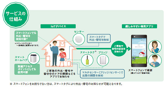 もうひとつ、子どもの帰宅状況や留守中の家の状況をスマホで知らせてくれる「おうちの安心プラン」も用意している。こちらは、ソニーネットワークコミュニケーションズと技術連携したIoTデバイスを活用した見守りサービスだ。