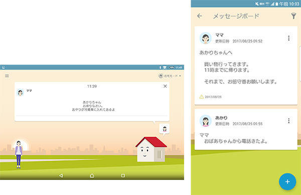 帰宅したときのメッセージ機能(左)とメッセージボード(右)