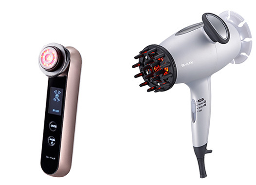 ヤーマンを代表する人気の美顔器「RF Beaute フォトPLUS」(左)と女性にも人気の「スカルプドライヤー」