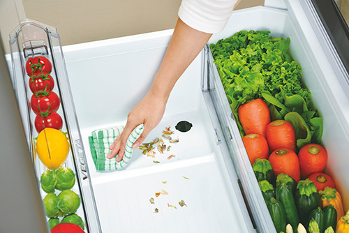 野菜室を引き出して下にゴミ箱を置けば、「お掃除口」から簡単に野菜くずを捨てられる