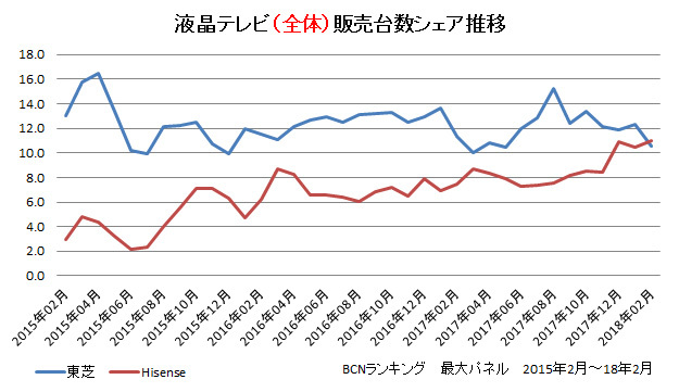 家電量販店・ネットショップの実売データを集計する「BCNランキング」から抽出した直近3年の液晶テレビ全体の販売台数シェアによると、東芝が10%台で浮き沈みしているのに対して、ハイセンスはじわじわとシェアを上げ、17年12月に初めて10%を突破。2月にはついに東芝を上回った。