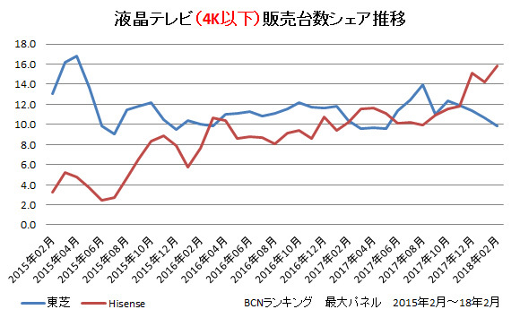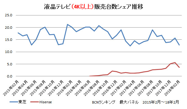 次に4K以上では、16年6月に参入したハイセンスが、右肩上がりで数字を伸ばしているが、まだ4K以下ほどのシェアは獲得できていない。東芝は4K以下と同様に上下動を繰り返しているものの、12~20%のレンジで4K以下よりも高いシェアを保っている。18年2月は約9ポイント差で東芝がリードしている。
