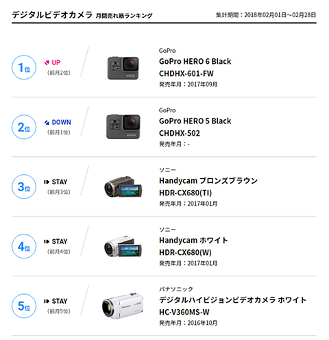 新旧GoProがワンツーフィニッシュ、2018年2月のビデオカメラ販売ランキング