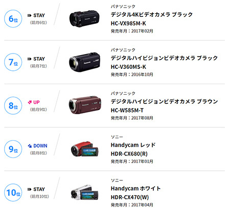 2018年2月のデジタルビデオカメラ 機種別販売台数6位~10位