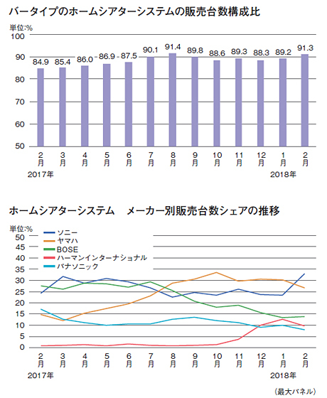 このところホームシアターシステムが売り上げを伸ばしている。2017年前半は2ケタ成長を記録するも、春以降あまりふるわなかった。しかし、秋以降は復調し、今年2月には販売台数・金額揃って2ケタ増と好調だ。
